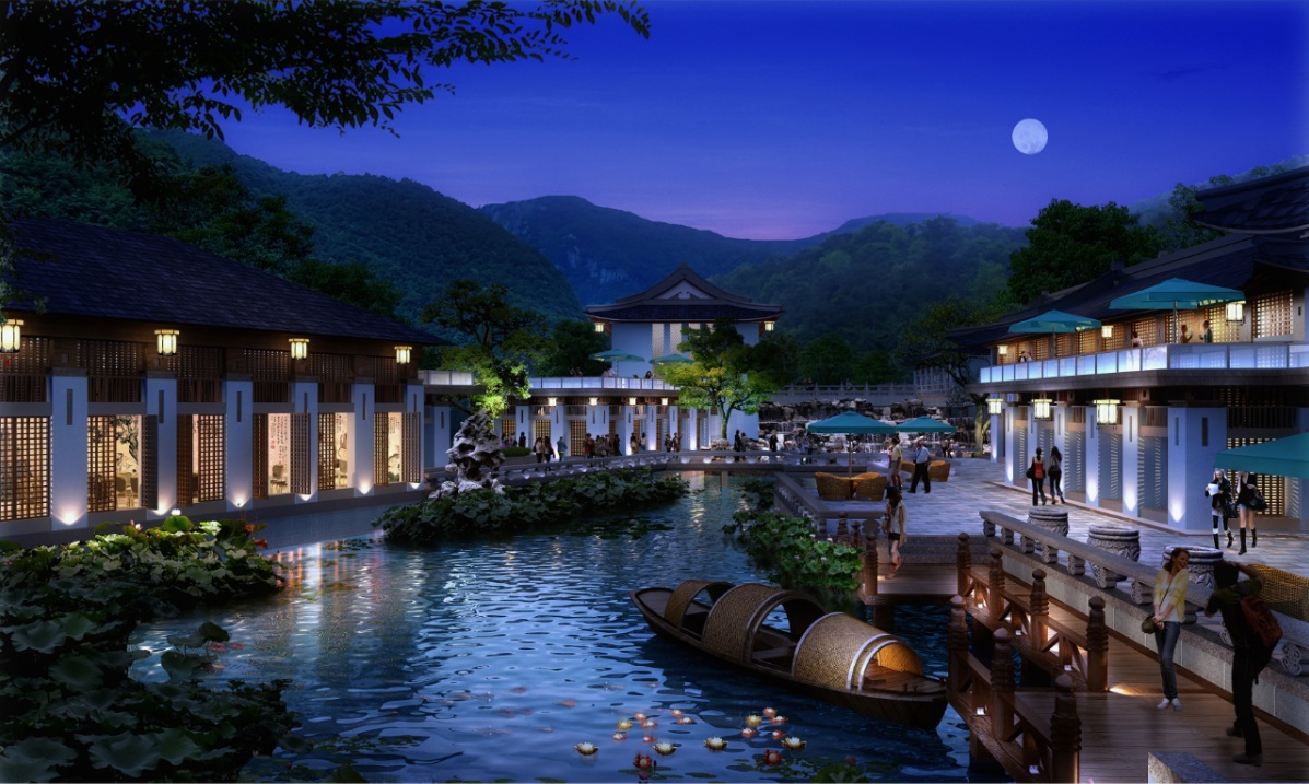 該項目位于行宮酒店規劃地塊東半部分峽谷區內,項目占地約50畝。該規劃設計以項目所在地土地、溫泉、環境、旅游人文等資源為依托,以溫泉養生為主題,突出帝王沐浴文化、禪佛道教養生文化、自然山水生態文化,結合基地獨特的峽谷地形進行溫泉主樓、溫泉園區、VIP湯院、洞窯湯屋功能產品規劃。