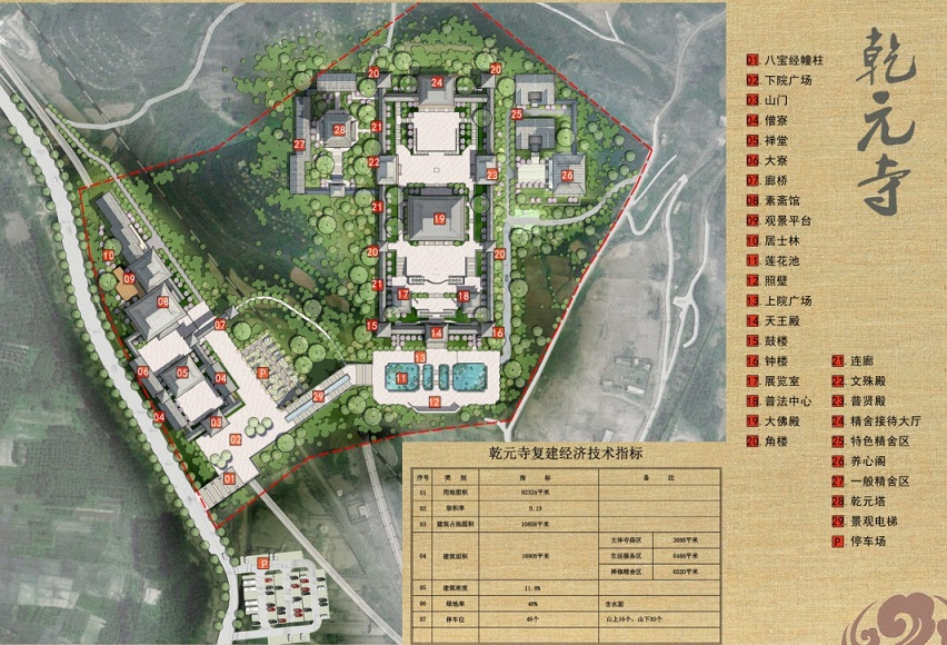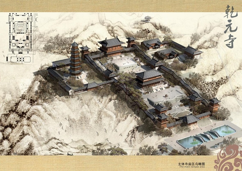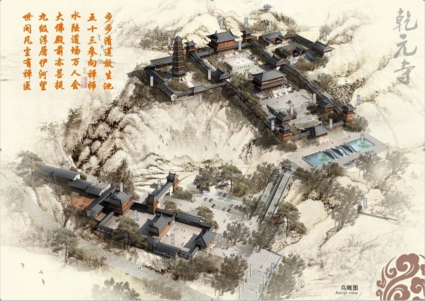 乾元寺總體布局是以“一軸為心、分上下兩院,有主題四區”,總用地面積92230平方米,其中主體寺廟區11565平方米,生活服務區7518平方米,公共活動區9616平方米,精舍禪修區14796平方米,停車場1866平方米,綠化生態區46869平方米。