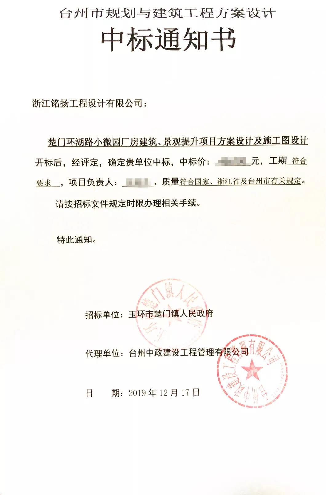 中標浙江省臺州市楚門環湖路小微園廠房建筑、景觀提升項目方案設計及施工圖設計。