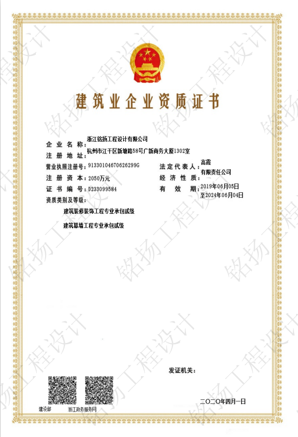 恭喜銘揚(yáng)工程設(shè)計(jì)建筑幕墻工程專業(yè)承包貳級(jí)資質(zhì)申報(bào)成功,新資質(zhì)的取得,標(biāo)志著銘揚(yáng)業(yè)務(wù)領(lǐng)域的新升級(jí),進(jìn)一步拓寬了業(yè)務(wù)范圍,增強(qiáng)了公司的知名度,使公司在對(duì)外交往中增加了一張亮麗的名片。