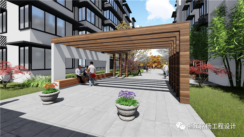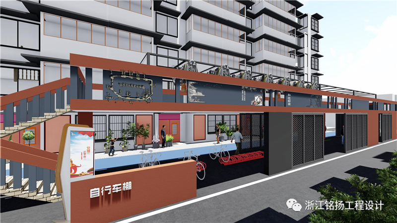 拆除破舊停車棚后,增設了鄰里共享空間,可以供居民在此交流、健身、停留。設計新的非機動車車棚9智能充電樁),并布置在道靠墻位置。