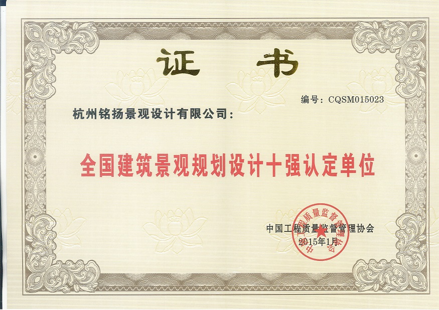 熱烈祝賀銘揚公司獲“全國建筑景觀規劃設計十強認定單位”